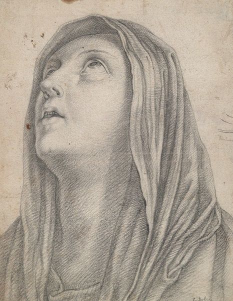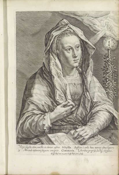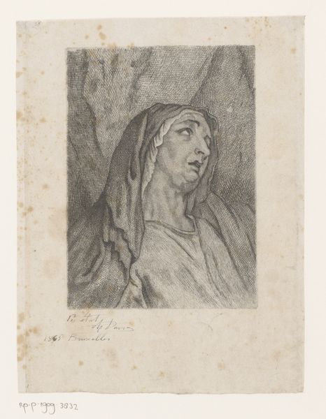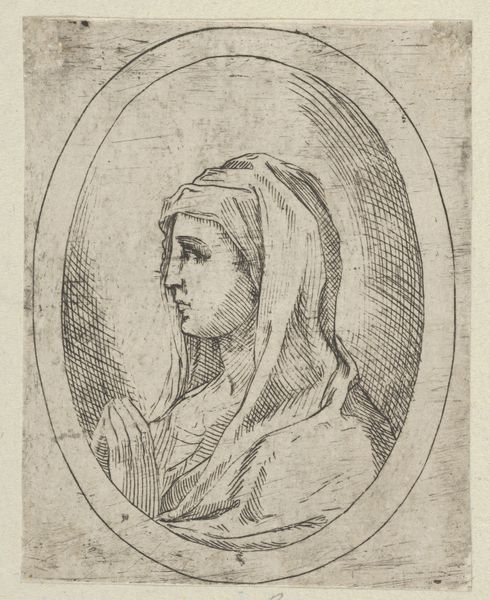 Curator: Let’s take a moment with this engraving. It's entitled “Portret van Isabella van Asturië,” dating somewhere between 1549 and 1577. What's particularly interesting is the mystery—the artist remains anonymous. Editor: There's a strange serenity about it. It’s almost as if she's trapped—the severe lines and dark shading giving off an eerie and melancholic vibe. What about you? What’s your immediate feeling? Curator: That stillness, as you say, reminds me of early Renaissance portraits where the sitter seems suspended, a sort of idealized version, maybe slightly lifeless, and the precise engraving enhances that sense. What catches my eye is the detailed hatching used to render the folds of her clothing and hood. Editor: Precisely. The weight of the fabric, visually heavy and all-encompassing. Considering her attire, almost monastic in style, could be laden with significant meaning and possibly alluding to more. Is this intended for wider circulation or restricted viewing? What does this representation portray in that context? Curator: That’s intriguing. Given it’s an engraving, likely intended for broader circulation and perhaps reproduction in books or pamphlets, it would serve a specific purpose: reinforcing Isabella’s image as pious, modest and virtuous, reflecting perhaps the role of women in her family, or maybe masking some darker realities… Editor: And those tiny, cherubic faces in the corners feel oddly out of place amidst such austerity. Perhaps a faint glimmer of hope or playful interruption in what would be another tragic depiction of the queen. Curator: Or perhaps simply ornamentation. Yet the way they’re positioned, gazing almost directly at her, does add an intriguing layer. I'm left pondering the complexities hidden beneath the surface, much like Isabella herself, probably. Editor: Right? A haunting portrait, demanding us to not simply see, but to truly consider what remains unspoken within those rigid lines. Curator: Indeed. And now I wonder, how would Isabella perceive the view that we currently hold about her portrait.