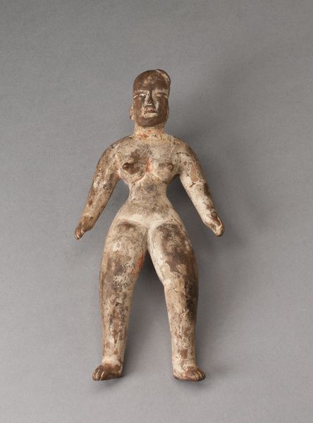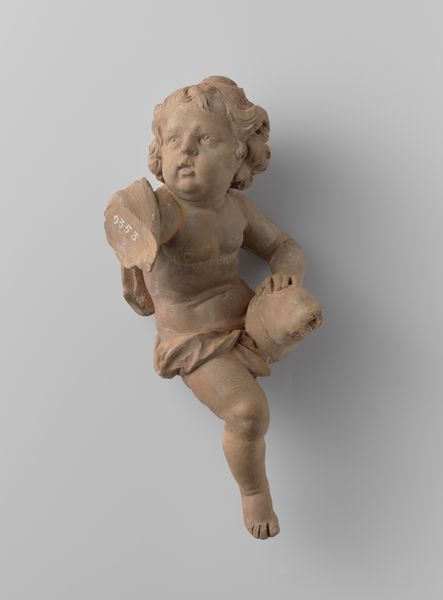 Editor: This is "Gevleugelde Putto," or "Winged Putto," a plaster sculpture created around 1800-1900, attributed to Eugène Lacomblé. The cherubic figure is oddly unsettling. How do you interpret this work? Curator: Its Neoclassical style and use of the putto motif are indeed telling. Consider the historical context: the turn of the 19th century was a time of revolution and shifting social orders. This idealized cherub, intended to evoke innocence and purity, is rendered in a somewhat crude and vulnerable form. Doesn’t it prompt questions about how ideas of innocence were constructed and potentially corrupted during this period? Editor: I see what you mean. The figure's missing forearm, the rough texture of the plaster – it subverts the perfect image you expect. Curator: Exactly. Think about the power dynamics at play. These putti were often commissioned by wealthy patrons to decorate their homes, reinforcing a sense of their own refined taste and social dominance. Yet, this particular putto feels almost like a critique of that very system, wouldn’t you say? Does the fragility, even the brokenness, suggest a challenge to established hierarchies? Editor: That's a really interesting point. I hadn't considered the socio-economic aspect. So, it's not just about aesthetic beauty, but also about the complex relationships between artist, patron, and societal values? Curator: Precisely. The 'flaws' make us confront the artificiality of these constructed ideals. It invites us to challenge the narratives that elevate some while marginalizing others. Editor: I've definitely learned a lot, considering not just what the artwork is, but what it represents in a broader cultural conversation. Curator: It’s a continuous questioning and unraveling, viewing art as an active agent in shaping our perceptions.