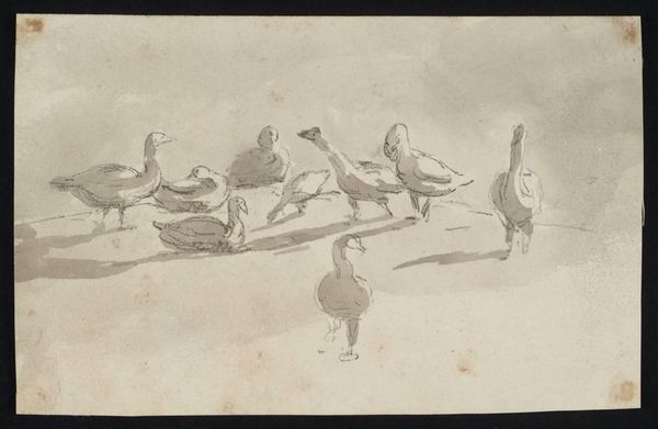 Karl Bodmer created "Oies, Cygnes, herons" as a study of the natural world, delineated with ink on paper. The composition is divided into four distinct quadrants, each presenting a different waterfowl in its natural habitat. Bodmer's use of line is particularly striking. Notice how he employs hatching and cross-hatching to create depth and texture, giving volume to the birds' plumage and suggesting the varied surfaces of water, grass, and earth. Each quadrant uses the same restricted tonal range to isolate and highlight the formal qualities of the waterfowl. The swan's serene posture contrasts with the heron's stooping stance, a visual signifier of distinct behaviors and ecological niches. Bodmer's approach is not merely representational, but also analytical. He is presenting an almost scientific study, inviting viewers to engage with the structural elements that define each creature. The artwork challenges us to consider how meaning is constructed through formal arrangement and the meticulous rendering of natural forms.