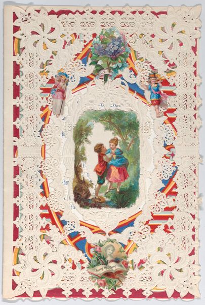 Editor: Here we have a work titled "Valentine," dating back to 1879. It's listed as by an anonymous creator and lives here at the Metropolitan Museum of Art. The piece combines drawing, collage, and printmaking techniques on paper. It gives me this sense of looking into another world, ornate and almost otherworldly with all its layers and frills. What jumps out at you? Curator: Oh, absolutely! It's a peek into a hidden garden, isn’t it? All that paper lace whispers of secrets. I imagine the maker carefully snipping, layering, dreaming of love’s elaborate dance. Notice the repeating patterns – almost dizzying, yet holding together, a tiny universe of affection. The central figure, the little boy with the letter, seems almost suspended in time, doesn't he? It reminds me of the Victorian obsession with hidden meanings... Do you see any recurring symbols, anything that might deepen that hidden language? Editor: Well, I immediately see how prevalent floral imagery is, not only with flowers but vegetal forms within the lace pattern itself. The flowers appear as almost a framing motif to guide our eye towards the central boy delivering, presumably, a love letter. Curator: Beautifully put. The floral motif – a gentle insistence on nature's fleeting beauty reflecting the enduring quality of emotion. It's like the maker is reminding us that even fragile things – a blossom, a hand-delivered message, affection – hold incredible power. It’s as though they captured lightning in a bottle! Editor: I see, that gives a lot of insight into both its period and material. Thank you! Curator: My pleasure! And isn’t it just fascinating how a seemingly simple Valentine can bloom with such depth and hidden stories? Always more to find.