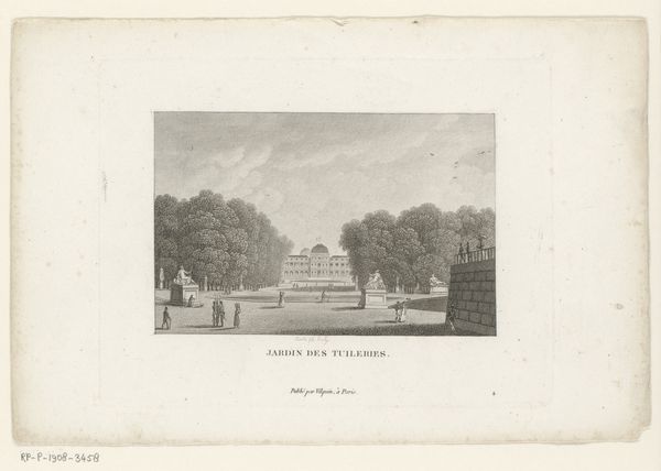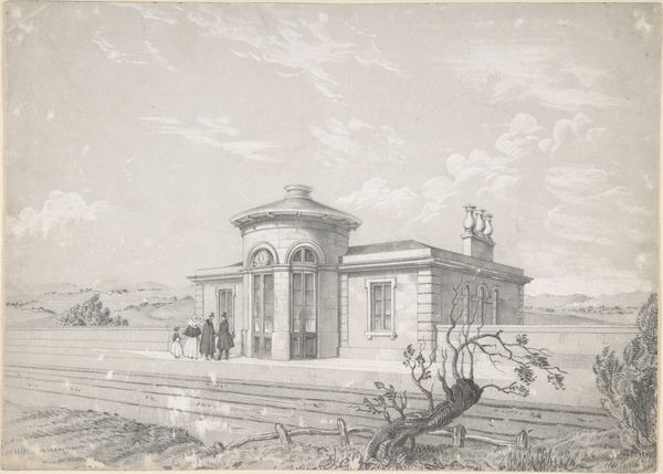 Editor: This is "View of the entrance to the Palacio de Seteais, Sintra," a drawing and print from 1840. It feels…staged. The architecture is grand, but the people seem placed, not really interacting. How do you read this piece? Curator: The “staged” feeling is quite revealing. The Romantic era often idealized landscapes while simultaneously reinforcing social hierarchies. Notice how the Palacio, likely a site of power and privilege, dominates the scene. The figures, rendered with less detail, become part of the landscape, their individuality subsumed by the imposing architecture. Consider, who commissioned this piece and for what purpose? Was it meant to showcase the palace's grandeur and, by extension, the power of its inhabitants? Editor: That’s a great point, thinking about who this was for! I hadn’t considered the power dynamics inherent in even a seemingly simple landscape. Is it fair to assume that landscapes weren’t always “just” landscapes? Curator: Exactly! Especially during this period, landscapes were often laden with socio-political meaning. The Romantic ideal frequently masked the realities of class, colonialism, and industrialization. A seemingly idyllic scene could conveniently ignore the exploitation that funded such opulence. What do you think the symbols placed on the building signify in relation to the everyday lives of common people during that period? Editor: The symbols seem removed and elitist; not for everyone! Thinking about it that way makes me see the piece very differently. I thought I was just looking at a pretty drawing. Curator: And now you see a layered narrative, a visual statement about power and social structures disguised as a picturesque view. Hopefully it offers a lesson on questioning surface appearances! Editor: Definitely. It highlights the importance of context and how art can reflect and reinforce social and political ideologies. Thank you!