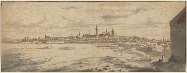 Curator: Rembrandt van Rijn's "The Goldweigher's Field" completed in 1651 using etching and drypoint, presents us with a captivating view of the Dutch landscape. What’s your first take on this scene? Editor: Immediately, it feels open and spacious. Despite the intricate detail in the foreground, my eye keeps being drawn to that luminous horizon. It's almost ethereal. Curator: Rembrandt’s landscapes, particularly his prints like this one, stand in interesting contrast to the highly idealized and classical landscapes of the time. This image is seemingly more quotidian. It seems to engage with both the prosperous mercantile culture of Amsterdam as well as with an idealized view of its countryside. Editor: And look how he uses line – sometimes incredibly delicate, sometimes much bolder – to suggest distance and texture. It's a bit like he’s sketching directly from nature, capturing the light dancing on the fields and the subtle shift in atmosphere. Almost poetic, I think. Curator: Indeed! The “Goldweigher's Field” likely references Jan Uytenbogaert, a prominent receiver of taxes. Beyond just documenting what he saw, Rembrandt was participating in the tradition of celebrating the achievements of merchants in a Republican state and showing their appreciation of its local land. Editor: That context makes it richer, knowing it's not just any field, but *the* Goldweigher's Field, viewed almost through the lens of admiration, elevating something everyday into the realm of symbolic meaning. A field made iconic through industry, commerce, a celebration of home. Curator: Precisely. The etching, its lines mirroring the furrows and roads below, becomes a meditation on ownership, labor, and the artistic representation of status and prosperity. Editor: Looking at the marks again, so confident, so immediate… there’s such life imbued in the landscape, that the status piece feels a bit softened by the overwhelming serenity of the whole composition. I find that fascinating. Curator: Me too. Rembrandt challenges our perception of status with the simplicity of natural depiction and perhaps democratizes the genre, inviting a more profound consideration of the social fabric surrounding these individuals. Editor: It reminds us to value the small slice of the world we occupy and the networks we cultivate with it, even in just a little etching such as this one. Curator: Precisely. "The Goldweigher’s Field" asks us to consider our own sense of place and participation in a narrative larger than ourselves, both historically and contemporaneously.
