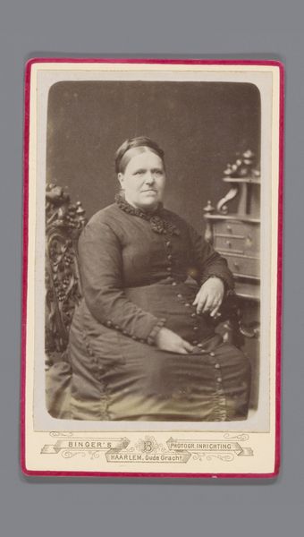 Curator: This is an interesting piece, a gelatin silver print photograph entitled "Portret van een onbekende vrouw, staande naast een stoel," placing its creation somewhere between 1855 and 1885. It depicts an unknown woman. Editor: Immediately, I’m drawn to the almost palpable sense of stillness and perhaps even weariness in this image. Her posture, the way she rests her hand on the chair, there’s a weight to it. Curator: It's compelling to consider the context. Gelatin silver prints revolutionized photography. The process allowed for mass production, bringing photographic portraits within reach of the middle class. It speaks to a democratizing shift in representation. Editor: Indeed. And the very act of having one's portrait taken in this era carries its own symbolic weight. This wasn't just about capturing a likeness; it was about cementing one's place in society, conveying status and respectability. Notice the formality of her dress, the subtle ruffles, and her jewelry. It speaks of aspirations and social positioning. Curator: It’s equally vital to recognize the labor involved. From the photographer meticulously preparing the chemicals and arranging the scene to the subject enduring a long exposure, posing in those restricting clothes, so very heavy perhaps in warmer weather. This speaks to the social performance embedded in portraiture and, of course, what's unseen in the final print: how did women experience the limitations on mobility as an embodied restriction? Editor: Thinking of what’s not seen is key here; what is absent. Who was this woman, what was her story, did she achieve all of these projected societal aims? The chair itself also becomes a potent symbol – it’s a prop, a support, but also indicative of a domestic sphere. It almost boxes her into place. Curator: Fascinatingly framed by this perspective! Examining how photography developed technologically, combined with those material restrictions and expectations, exposes how it was very much a tool used to uphold certain class structures and cultural standards, but there were still methods that subjects such as this unknown woman and the photographer employed to exert themselves. Editor: I appreciate the reminders here that there are multiple narratives to be interpreted, even within the still frame of a simple photograph; many levels of aspiration and desire exist here. Curator: Yes, examining the interplay of medium, labour and social forces offers us nuanced access to these stories and reveals them to us in material and psychological frames.