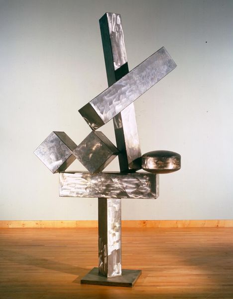 Curator: What strikes me immediately about Iwan Puni's "Relief," currently held at the Tate, is its rather somber mood given the playful arrangement of shapes. Editor: The materiality of the found objects really speaks to a moment of resource scarcity, perhaps a post-war reflection on consumption and repurposing, don't you think? Curator: Perhaps, but the jutting angles and bold colors – that cobalt semicircle particularly – feel defiant, almost like a child asserting joy amidst the scraps of a broken world. Editor: Interesting take! It's easy to look at the construction itself – how Puni affixed these disparate elements – and see a commentary on labor, the physical act of making as a statement itself. Curator: For me it’s as if each shape is a fragment of a memory, pieced together to create a whole that is both familiar and utterly strange. Editor: Well, I'm leaving here today with a reinforced appreciation for the art and how it challenges the boundaries between "art" and "craft." Curator: And I with a renewed belief in the power of art to find beauty in the broken.