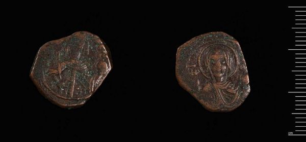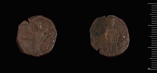 Curator: This is a Byzantine copper coin, issued during the reign of Manuel I Komnenos. What strikes you about it? Editor: The sheer wear and tear! You can see it's been handled, exchanged, and maybe even lost and found. The weight of its history is palpable. Curator: Absolutely. Think of the laborers who mined the copper, the artisans who painstakingly created the dies, and the social implications of everyday exchange. Editor: And the imagery itself projects power—Manuel is depicted in elaborate imperial regalia, signaling the might of the Byzantine empire and its economy, even in this small token. Curator: Exactly. It's a tangible representation of imperial authority and its reach into the lives of ordinary people. Editor: It brings the museum context alive, doesn't it? This coin wasn't meant for display, but for circulation and economic transaction. Curator: Indeed, studying its materiality and design brings us closer to the realities of Byzantine life and political power. Editor: It's humbling to consider this coin's journey through time and the human hands it passed through.