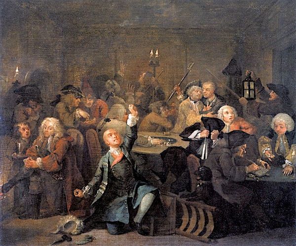 Curator: Hogarth’s “The Banquet,” created in 1745, explodes with detail, doesn’t it? Look at how chaotic and carnivalesque the composition seems. What strikes you first? Editor: Pure excess. It’s almost grotesque. The sheer volume of figures packed into this room—the food, the mess, it speaks to a society reveling in its own decadence. I can almost smell the stale ale. Curator: Hogarth's masterful use of caricature heightens the effect, wouldn't you say? It leans heavily into Baroque dynamism but with that very clear social commentary he’s known for. We have musicians playing, someone passed out at the table... and children behaving badly. Editor: Precisely. The open book at the feet of the unconscious figure—it is as though education and higher thought lie discarded amidst the revelry. Look, over there—are they burning ledgers by the door? It implies fiscal irresponsibility; perhaps gambling debts or worse! Curator: Some consider it to be about a contested election—allegories were certainly the order of the day when dealing with political or otherwise sensitive subjects! Notice the central figure of a woman surrounded by foppish men—the implication is a lack of authentic leadership. The banner above is equally opaque in meaning. Hogarth invites a multiplicity of readings. Editor: Indeed, Hogarth, so often hailed as a moral commentator, understood the seductiveness of the very behaviors he critiques. The energy of the crowd draws the eye, it's a chaotic symphony—a fascinating historical snapshot as well. Who would want to return to that scene and time? Curator: Perhaps nobody, but maybe somebody! We all can probably think of banquets of this type that we’d never forget! Thanks for highlighting its continuing significance for us today. Editor: The pleasure's been all mine. May it spark ongoing discussions of power, corruption, and the spectacle of it all.