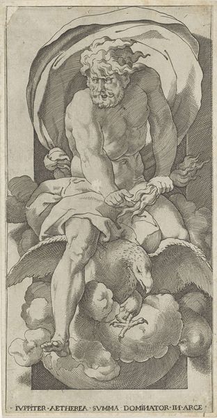 "Plate 3: Jupiter emerging from a niche, riding an eagle and holding a thunderbolt in his left hand," was created by Giovanni Jacopo Caraglio, in the 16th century, a period marked by the Renaissance's revival of classical antiquity. Caraglio's print presents Jupiter, the Roman iteration of Zeus, as a figure of supreme power and authority. The god's muscular physique and commanding presence reflect the era's fascination with idealized human forms. Simultaneously, this depiction reinforces a patriarchal image of power, deeply rooted in the socio-political structures of the time. Jupiter’s dominance over the eagle, a symbol of imperial strength, speaks to the period's investment in hierarchical power structures. The intensity in Jupiter's eyes and the drama of his emergence invite us to consider the emotional landscape of power. The print both reflects and shapes the viewer’s understanding of divine authority in a world undergoing seismic shifts in religious and political thought.