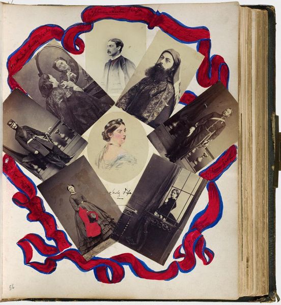 Editor: Here we have an untitled photo album page by Mary Georgiana Caroline Cecil Filmer, featuring photos of family members and even royalty! The blue ribbon motif gives it a celebratory feel. What stands out to you about this collection of images? Curator: For me, it’s about power and performance. Consider how photography itself was a tool of representation, available mostly to the elite. Editor: Because it was so expensive? Curator: Exactly. And then look at the symbols - flags, royal crests...The album is a curated narrative of status. Even the intimate family photos are carefully constructed performances of identity. It makes you wonder about what stories are being told, and whose stories are being left out, right? Editor: That's a perspective I hadn't considered. I now see it as more than just a scrapbook. Curator: Indeed, these were carefully crafted statements.