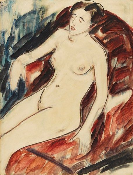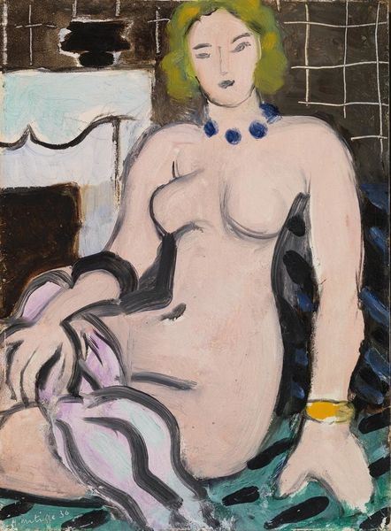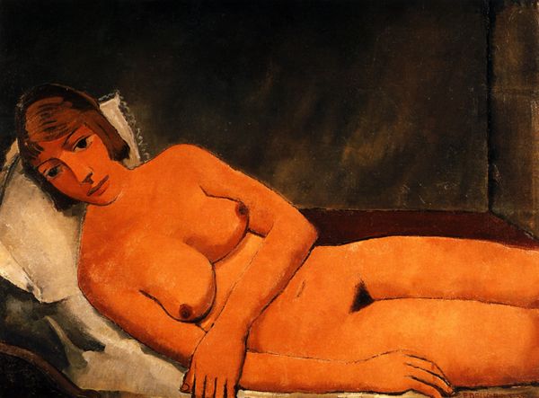 Curator: Ah, another intimate gaze cast upon us! Before us, we have Amedeo Modigliani’s “Nude on a Blue Cushion,” an oil painting created in 1917. What strikes you initially? Editor: A kind of tender unease. There’s something almost melancholic about her relaxed pose juxtaposed with those sharp, angular lines that define her form. It's as if she is revealing herself while simultaneously retreating, and I would love to find myself enveloped by that shade of blue in that luscious pillow she lies upon. Curator: Precisely. Modigliani manipulates the viewer's perception of intimacy by deliberately distorting classical ideals. Her elongated neck and simplified features, hallmarks of Modigliani's style, shift the focus from mere physical representation to the emotional core. It has often made me think of an inside joke only the painter and the subject understand. Editor: Indeed, there’s a conversation happening through the forms themselves. The flattened perspective and restricted palette—mostly earthy tones with that brilliant, defiant blue—draw attention to the materiality of the painting. Look closely at the impasto brushstrokes! The surface texture almost contradicts the smoothness of the nude's skin. There is an odd feeling between intimacy and disinterest. Curator: It's a masterclass in using visual language to convey complex emotions. Modigliani wasn't just painting a body; he was painting vulnerability. The slightly downturned gaze and the relaxed hand resting on her chest hint at a deeper introspection. The body language says 'resting' and the face conveys a deeper emotion. Editor: The figure is not trying to perform any type of ideal form or seductive pose as if she wants to be loved for her body alone. I read that, ironically, these paintings caused a scandal back then, but the emotional truth conveyed transcends such noise and controversy. A masterwork indeed, so much expressed within simplicity. Curator: I concur. There is simplicity in expression, emotion in its truest, most basic, form, displayed here. Modigliani's Nude reminds us of the beauty and fragility of the human experience through the nude. Editor: Right! Thank you for that journey into form, vulnerability and true painting!