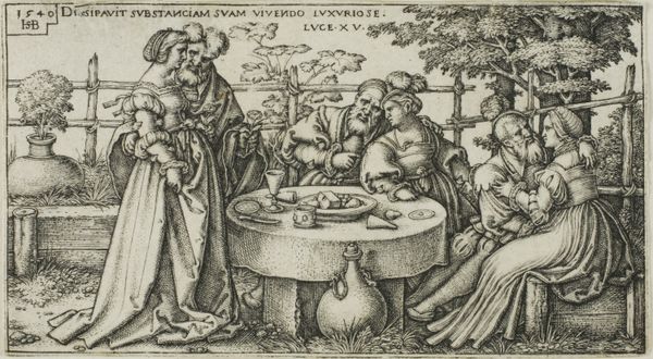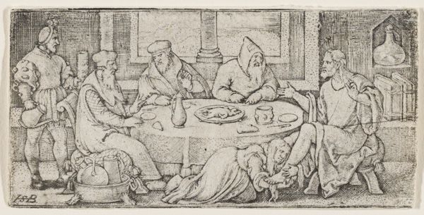 Sebald Beham made this tiny print, Christus in het huis van Simon de Farizeeër, using engraving, a printmaking technique, sometime before his death in 1550. The engraver uses a tool called a burin to carve lines into a metal plate, which are then inked and printed onto paper. This allows for incredibly fine detail, as you can see in the textures of the clothing and faces. The real skill here lies in the manipulation of the material, using the burin to create the illusion of depth and volume. The act of engraving, like other forms of craft, involves a direct engagement with the material, and a deep understanding of its properties. Beham shows great mastery of the technique. Looking closely, you can see how the density and direction of the lines create shadows and highlights, bringing the scene to life. This print is not just an image, it's a testament to the artist's skill, and the power of craft to convey complex ideas.