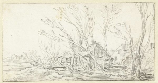 Editor: Here we have Jan van Goyen's "Houses on a Dyke near Houtwael", created around 1650 with a humble pencil. It’s quite a simple sketch, but there’s something about its almost nonchalant quality that I find intriguing. What’s your take on it? Curator: Well, let's consider this drawing in its historical context. The Dutch Golden Age witnessed a surge in landscape art, reflecting a growing national pride and identity. Artists like van Goyen captured the everyday life and topography of the Netherlands. How do you see this drawing fitting into that socio-political narrative? Editor: I suppose the very ordinary subject matter – just houses on a dyke – is indicative of a focus on the local and the everyday. But why make art about something so… mundane? Curator: Precisely! These were often created for a burgeoning middle class eager to decorate their homes with imagery that celebrated their surroundings and hard-won prosperity. There's a political dimension too, right? Van Goyen romanticizes a landscape heavily engineered, implicitly highlighting the Dutch Republic's ingenuity. Editor: So, in a way, it’s a subtle form of national self-promotion? The composition feels informal but the implications of that landscape are more powerful than I first considered. Curator: Exactly! Van Goyen wasn't just drawing houses; he was documenting a constructed environment that represented the aspirations of an emerging nation. And we can't ignore the patronage. Editor: I see, the audience shaped the message! Looking at it again, I'm struck by the realization that this drawing speaks volumes about a society's values, beyond its simple appearance. Curator: Yes, and it underscores the importance of viewing art as embedded in complex cultural and historical forces. A seemingly simple sketch reveals layered meaning when we unpack it with contextual understanding.