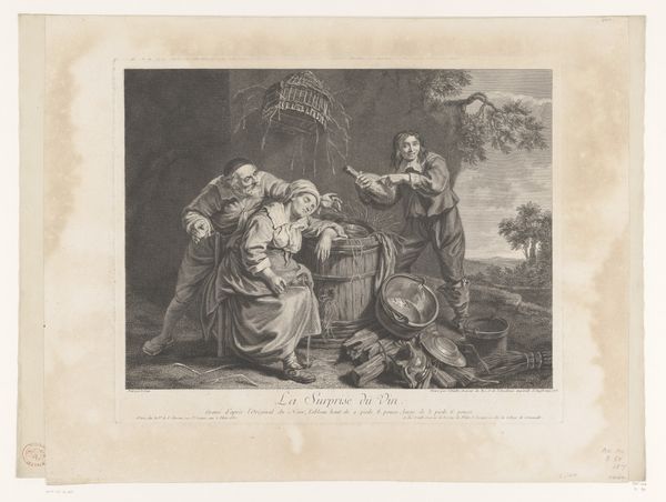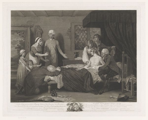 William Walker’s engraving, *Portret van Balthazar Gerbier, Deborah Kip en hun kinderen*, presents a study in contrasts, realised with a muted monochrome palette. The formal arrangement invites an analysis of power dynamics within the family unit through the organisation of space and form. The composition is structured with a series of vertical lines, from the imposing columns to the standing figures of the parents, which flank the cluster of children. This architectural structure provides a backdrop that lends formality and permanence, while the organic disarray of the children introduces a dynamic counterpoint. The engraver uses light and shadow to sculpt the figures, drawing attention to their faces. This detailed attention contrasts with the looser treatment of the background landscape. By examining these formal elements, we can consider how Walker constructs a narrative about family and status. The calculated arrangement of figures within a structured setting suggests a negotiation between natural affection and social expectation, revealing enduring themes of representation in art. These are continually re-evaluated through the lens of cultural change.