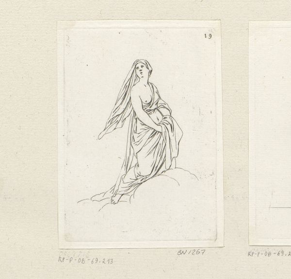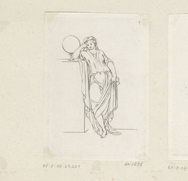 Louis Fabritius Dubourg rendered this sketch of a kneeling woman with a comb using pen and gray ink. Consider the comb, an ancient tool, depicted here in the hand of a classical figure. We see it not merely as a grooming aid but as a symbol of transformation and preparation. In antiquity, such acts of grooming were imbued with ritualistic significance, think of the toilette of Venus, preparing for love, or of funerary rites. Observe how this motif echoes across time. A similar gesture appears in early Christian art, where combing hair symbolized purity and readiness for spiritual union. The act takes on a psychological dimension. It speaks to our subconscious desires for order, control, and the presentation of self. The kneeling posture, combined with the intimate gesture, creates a powerful engagement, stirring deep within us notions of beauty, ritual, and the eternal human quest for self-refinement. It's a cyclical progression, where ancient symbols resurface, evolving and acquiring new layers of meaning across history.