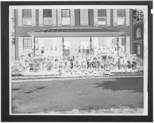 Curator: This gelatin silver print, roughly 4 by 5 inches, titled “Untitled (students march down street)” is by Hamblin Studio. The exact date is unknown. Editor: My first impression is the stark contrast gives it an almost ghostly feel, like we're seeing a memory resurface. Curator: The figures marching hold signs, perhaps echoing larger social movements, visually anchoring cultural memory to this procession. Editor: Absolutely. It also feels staged, almost performative, which complicates its reading as raw documentation. Where does conviction meet representation? Curator: The repetition of figures creates a sense of unity, but also anonymity—a powerful symbol of collective action. Editor: It makes me think about the role of photography in shaping, and sometimes manipulating, our understanding of collective movements. The inversion of the photograph makes it feel like this is still developing, still in progress. Curator: Precisely, this image, even in its reversed state, reminds us of the enduring power and complexity of visual symbols in shaping cultural narratives. Editor: And the ongoing need to critically examine the narratives they construct.
