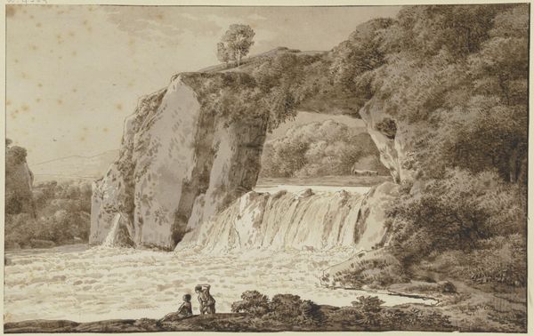 Curator: Robert Adam, better known as a neoclassical architect, created this watercolor titled "A Chasm, with Figures." Editor: Initially, I find the composition quite striking; the imposing cliffs dwarf the figures, creating a sense of awe and vulnerability. Curator: Adam's handling of the pigments here is fascinating; it feels so very connected to his architectural work, a study in contrasts. Light and shadow define the geological forms. How do these material techniques inform or perhaps obscure his intention? Editor: The muted color palette establishes an atmosphere of subdued grandeur, enhancing the natural beauty. What I find most alluring is the way the verticality of the cliffs interacts with the horizontal flow of the water. Curator: Right. The scale demonstrates a Romantic engagement with sublime nature, placing humanity against the vastness of the earth's crust and the erosive power of water. The labor of geologic time, depicted through watercolor. Editor: Ultimately, Adam's strategic use of form and color shapes our viewing experience, inviting a contemplative mood. Curator: I'll consider that as I examine Adam's broader cultural project of bringing a sense of classical order to the natural world.