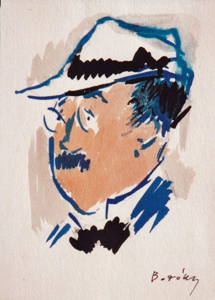 Philip Akkerman created this watercolor self-portrait in 1997, presenting us with a study in form and monochrome. The painting's structure relies on the interplay of light and shadow, rendered in varying shades of blue, which defines the contours of the face and hat. The artist captures his likeness with a somewhat detached gaze, inviting us to consider the semiotics of self-representation. Akkerman seems to destabilize the conventional portrait by reducing the color palette to a single hue. This challenges our expectations and prompts a deeper engagement with the formal elements of the work. The hat, with its ribbon and textured surface, adds a layer of complexity, contrasting with the smoother rendering of the face. Ultimately, the artwork encourages us to question the nature of identity. It uses a restricted palette to generate a conversation about the essential components of portraiture, pushing against traditional notions of artistic representation.
