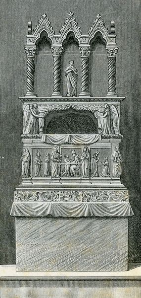 Giuseppe Barberis captured this baptismal font in the Church of San Giovanni Evangelista with skilled strokes of pen and ink. The print captures the weight and texture of the stone, showcasing its carved surfaces and the figures set within arches. The process of carving stone demands patience and precision, skills honed over years of practice. Each strike of the chisel requires control, transforming raw material into refined form. We can imagine Barberis studying the light as it played across the font’s surface, translating this three-dimensional presence into lines on paper. The image also reminds us of the social context of religious art. The creation of such an object would have involved a network of patrons, artisans, and laborers, each contributing to its realization. By focusing on the materiality and making of the font, we gain insight into the cultural values that were at play in its creation, and the skilled traditions that straddle both craft and fine art.