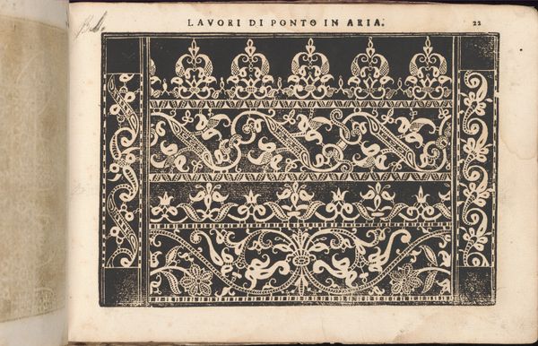 Isabella Catanea Parasole created this woodcut design for needle lace in Italy, around the turn of the 17th century. It is one of many patterns in her book, "Teatro delle Nobili et Virtuose Donne," a title that speaks to the gendered division of labor and the roles women were expected to occupy. The image itself is a dense, repeating pattern of geometric and floral motifs, typical of the "punto reticella" style. This was a popular form of lace, often used to adorn clothing and household linens of the upper classes. The publication of such pattern books reflects the growth of the printing industry and its impact on the dissemination of design. It also reveals the increasing importance of fashion and luxury goods in the economy of Renaissance Europe. Moreover, Parasole's book suggests a growing recognition of women's artistic and economic contributions, at a time when their roles were often marginalized. By consulting primary sources, such as inventories, fashion treatises, and other pattern books, we can begin to understand the social and cultural significance of works like this.