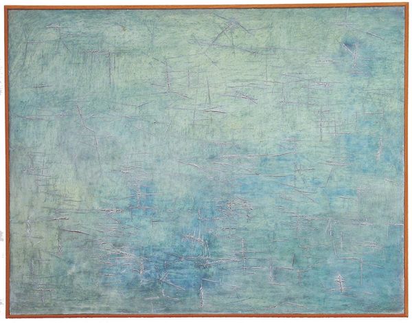Curator: Here we have Kazuo Nakamura’s "Morning Mist," created in 1951. It’s a stunning example of abstract expressionism rendered in watercolor. Editor: My initial reaction is the tranquility of it; a very calming blue that dominates, but the geometric lines layered throughout bring forward a sense of barely contained tension. I want to touch the surface. Curator: Considering the post-war era in which it was produced, that tension could be read as reflective of the anxieties and uncertainties prevalent at the time. Artists like Nakamura were grappling with a rapidly changing world. Editor: Yes, you can see his methods employed at their fullest extent with watercolor on this canvas! It seems simple on first glance. But his approach suggests deep labor. See how the impasto almost adds dimension to such gentle medium. Curator: Absolutely. Abstract Expressionism, particularly after the Second World War, became a key movement through which artists could explore complex emotions without directly referencing the horrors of conflict. Editor: Right, his engagement here goes against typical conventions of fine art by exploring materials we frequently dismiss or take for granted. The piece allows us space to value process alongside imagery and context. Curator: And it reflects a shift in the art world at the time, increasingly seeing the rise of the artist and challenging traditional academies, as artists took on new levels of celebrity, moving into gallery spaces, such as Peggy Guggenheim’s Art of This Century. Editor: It speaks of consumption too. Watercolour as an inexpensive, utilitarian medium, suddenly the central material. Nakamura makes you think about how we attribute artistic and economic value to mundane, every day tools. Curator: Precisely. It’s about more than just individual expression. The very act of creating this type of abstract art became intertwined with asserting freedom and individualism in a world that was rapidly standardizing. Editor: Ultimately, it invites one to consider the weight inherent to simple art making. Curator: I'd agree. The work provides space to look to materials in new ways and consider the shifting role of art at a pivotal moment in the twentieth century.