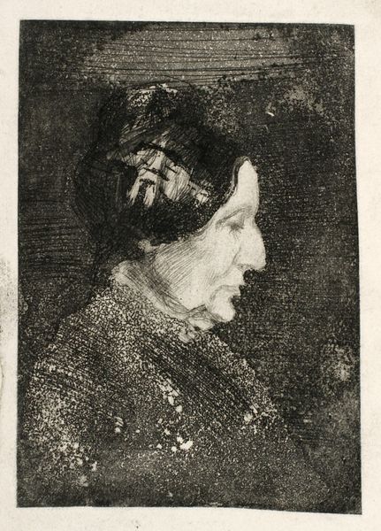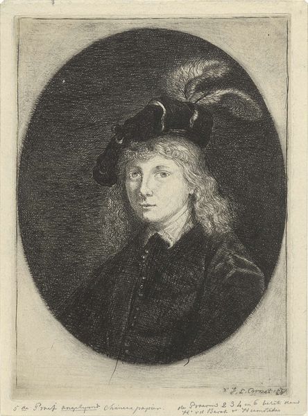 Curator: Ah, this engraving, "Tronie van een man met gevederde baret" by Johannes Mock, created in 1827. A striking print. What are your initial thoughts? Editor: The feathered beret immediately conjures images of theatrical costume, masking and posing. There’s a gravity there too, but it’s playing with the guise of nobility. Curator: I agree the theatricality is significant. Observe the diagonal hatching; it builds up the form, creating tonal variations and highlights that give the print structure and visual depth. The lines themselves guide the viewer's eye. Editor: Those textures add to the psychological effect too. The hat becomes almost a halo, and the ruffled clothing feels performative; those clothes suggest someone ready to assume a certain character, hiding perhaps behind this historical, romanticized trope. Curator: Perhaps a visual commentary on role-playing. The artist uses line work to direct the emotionality of the figure, subtly creating narrative through contrasts of light and shadow on the man's features. It speaks to a wider culture, of portraying emotions through dress and composition. Editor: Yes, portraiture has always carried such weight – beyond mere depiction of identity it seeks to distill or project power through recognizable imagery. The hat, the pose—these visual codes resonate still today. Curator: In his manipulation of line and form, Mock isn't merely documenting; he's crafting a complex, enduring composition. Editor: Exactly. Through exploring how images connect through time, it’s fascinating to see cultural values and ideas mirrored through Johannes Mock, almost 200 years later. Curator: Indeed. By understanding the structure and aesthetic decisions made in this piece, the themes embedded in it begin to present themselves more openly. Editor: Agreed, an intersection where technique, history and humanity all converge to fascinating ends.