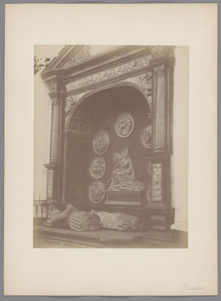 Editor: So, here we have a photograph, likely a gelatin silver print, taken before 1885 by Carl Heinrich Jacobi. It depicts an altar with a sculpture, believed to be Boniface, inside the San Marco in Venice. The details are amazing, it has quite a solemn feel, capturing the grandeur of the church interior and the intricate sculptural work. How would you interpret this image, especially considering its historical context? Curator: This photograph gives us a fascinating glimpse into the late 19th century’s engagement with religious art and architecture. The photograph itself, as a medium, was still relatively young, and its application in documenting and disseminating images of important cultural sites was significant. Think about it – how else could people so easily access and study these artworks from afar? Editor: That’s a great point; the photograph democratized art viewing! But what about the choice to focus on this particular altar? Was there anything specific about Boniface or the San Marco that might have made it a popular subject at the time? Curator: Absolutely. San Marco held enormous symbolic power for Venice, representing its wealth, history, and connection to religious authority. Depicting Boniface specifically – if it is him – also speaks to a broader interest in figures who shaped the early Christian Church. It subtly reinforces notions of cultural and religious heritage being associated with Venice's own narrative of power and legitimacy. This image isn’t just about aesthetics; it’s about constructing a visual narrative. Editor: I see. So the photograph functions almost like a propaganda tool, subtly promoting Venice’s cultural significance through documentation of its sacred spaces. That gives me a totally different way of looking at it! Curator: Precisely. Consider, too, the photographer's choices—the composition, the light. They contribute to this carefully constructed message about Venice and its history. These are decisions that carry social and cultural weight. Editor: This has completely changed my perspective on the piece. I was so focused on the aesthetic qualities, I didn’t think about its possible public role. Thanks for sharing your insight. Curator: And thank you for noticing these critical elements within it. Thinking of a work’s greater meaning or place allows us to have a new appreciation for it.