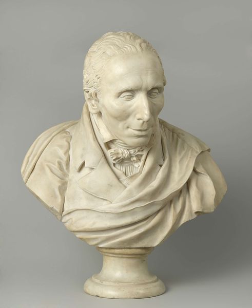 Curator: This is a plaster bust of Joel Barlow, created in the 18th century by Jean-Antoine Houdon. You'll find it here at The Met. Editor: Wow, that gaze could cut glass. He's certainly got a look of determination about him. Almost… severe? Curator: Barlow was quite the character – an American poet, diplomat, and political theorist. He moved in circles of revolutionary thinkers in both America and France. His writings often critiqued aristocracy and championed Enlightenment ideals. Houdon, celebrated for his portrait sculptures, captures this intensity masterfully. Editor: You know, I can't help but wonder what it felt like to sit for something like this. Imagine holding that stern pose for hours! Was it about power? Being immortalized in this… stony stoicism? Did he even crack a smile? Curator: It's interesting you say that. Portraiture of this era often served as a means of projecting status and conveying specific ideological messages. Think about who commissioned and consumed these images. Barlow was a prominent intellectual, invested in shaping his public persona. Houdon understood that. Editor: I suppose. It still feels… performative. I almost want to deface it… just kidding. Mostly. The cool, smooth plaster against the almost aggressive set of his jaw is jarring, you know? Gives me uncanny valley vibes. Curator: The neoclassical style favored idealization and restraint. Perhaps we can read that "unfeeling" aesthetic as indicative of the societal constraints and expectations placed upon figures of authority, especially during a period marked by political upheaval. His achievements seem intertwined with certain performances of masculinity and power. Editor: Fair enough. All the history and revolutionary fervor aside, it's a stunningly crafted object. Flawless, even. I bet this bust was the 18th-century equivalent of a killer LinkedIn profile picture. Curator: (chuckles) Precisely. Houdon certainly had an eye for detail and understood how to craft images that resonated with power and authority. His legacy is still felt today, both in terms of portraiture and of historical representation. Editor: Looking at it now, I appreciate the precision and skill it took to create it. A portrait that demands to be remembered, even centuries later. And all the political gamesmanship too, of course. Curator: Indeed, a compelling figure immortalized in a tumultuous time, inviting us to continuously re-evaluate historical narratives and representations.