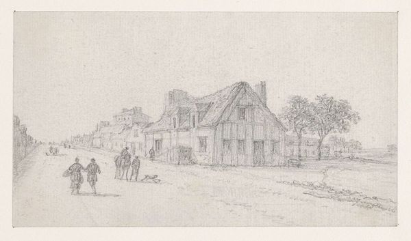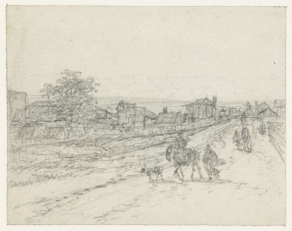 Editor: This pencil drawing, titled "Saint Cloud (?)", is by Georges Michel, created sometime between 1773 and 1843. The soft greys and the sketched details give it such a transient, dreamlike quality, like a fleeting memory of a place. What do you see in this piece, particularly concerning symbols that speak to its time? Curator: It evokes, doesn't it, that particular 19th-century yearning for an idealized past, filtered through Romanticism. Notice how the architectural forms—the church spire, the formal building—are softened and integrated into the natural landscape. It's as if the artist is collapsing time, presenting both the structured world of humans and the enduring presence of nature, hinting that nature will prevail. Editor: That makes me think about the figures populating the landscape—their almost casual presence against this backdrop of...historical weight, I suppose? Curator: Precisely! These are not heroic figures dominating the scene. They're part of a continuum, almost footnotes to the landscape. Their placement implies a relationship of belonging but also transience. Michel uses them to anchor us, the viewers, within the grand, temporal scale of Saint-Cloud itself, and the ever-returning presence of nature. Consider the role of drawing itself; is it a tool to capture, archive, idealize, or monumentalize? Editor: I guess I hadn't thought about it as collapsing time so much. More like, capturing a specific moment. Curator: But consider the suggestive, indistinct quality of the forms! It’s less about specificity and more about a feeling, a nostalgic echo. The city is already, perhaps, becoming a ruin even as it stands. It's a powerful premonition, subtly embedded in an unassuming drawing. Editor: I never considered landscape as a symbolic ruin! Thanks for the different perspectives on this work! Curator: Likewise. Exploring these images helps us connect past with present.
