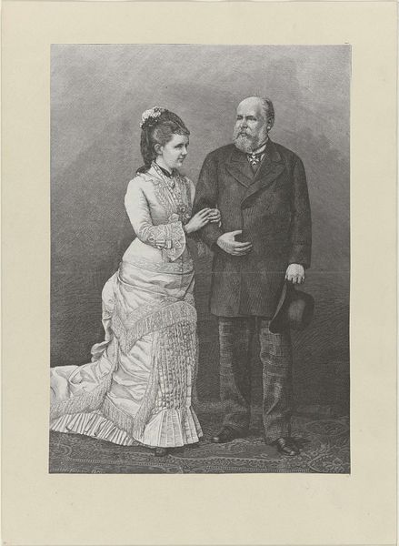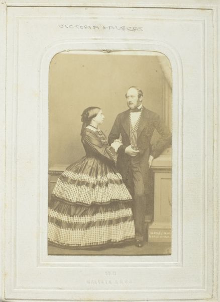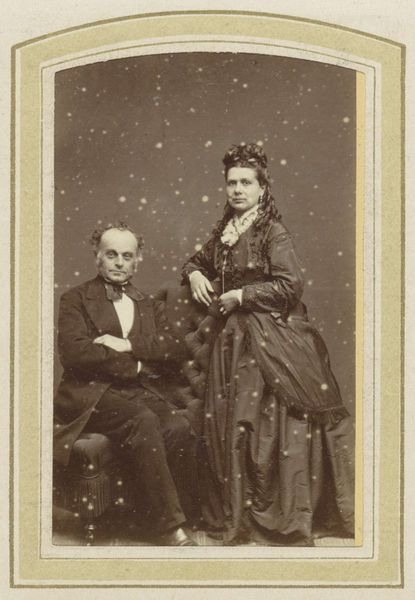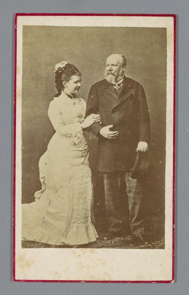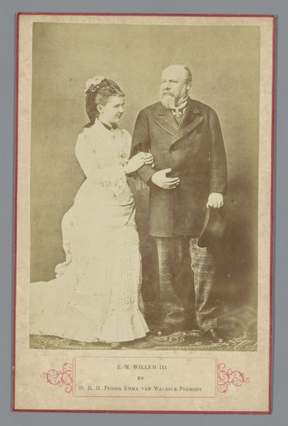 Curator: Here we have a portrait from the late 19th century, likely between 1880 and 1890. It's an albumen print depicting King Willem III and Queen Emma. The photograph is held at the Rijksmuseum. Editor: It has a ghostly aura about it, like peering into the past. The aging of the paper, the sepia tones...there's an inherent melancholy. Curator: Portraits of monarchs during this period served a clear function: projecting power and stability, influencing public perceptions. We see it reproduced extensively. Consider its dissemination via new technologies and how crucial that was to establishing an image of royalty. Editor: But even the process reveals something about control, or the illusion of it. The laborious process of preparing the gelatin-silver-print. All those steps – the coating, sensitizing, exposing, developing – a far cry from our instant snapshots. Think about the skill invested, the chemical industry needed to support it… Curator: Precisely. The creation and distribution of such images was becoming highly industrialized. Royalty portraits affirmed existing power structures but they also provided economic benefits to various producers from photographers, lab assistants to chemical suppliers. Editor: I can almost feel the paper's texture; the chemicals layered, soaked and set over the paper, that specific alchemical manipulation to achieve a likeness. A constructed reality – the stiff pose, Emma clinging to his arm for balance as if holding on to something fading or falling away. Curator: She looks almost like she’s pleading! There’s such calculation evident. Arranged marriages were tools of statecraft. This wasn’t about love. What appears as romantic support could very well be a carefully posed statement for public consumption. Editor: The clothes of King Willem the Third must also be considered; in many respects, garments carry weight. And what is to be seen as the role for the common man who has no means? Curator: Absolutely. Even seemingly candid portraits become loaded when scrutinized through the lens of political and social influence. The king wearing the same, simple business attire as others in court… it implies certain messages, particularly in a class conscious time. Editor: Examining its materiality exposes an inherent contradiction: attempting permanence through fragile means, constructing an image of enduring royalty on a substrate destined to degrade, turn yellow, and crack. But I think this conversation, though… has perhaps cracked open some truths! Curator: I couldn't agree more. Looking at this image, with all its complexities, reminds us of the role that art plays in history.