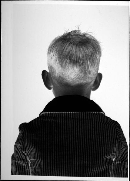 This photograph, by Robert Burian, captures the back of a boy's head with an intriguing interplay of light and shadow. Made using traditional black and white film photography, it presents a study in textures and tones. The smooth expanse of the boy's neck and the soft, wispy hair contrast sharply with the patterned knit of his shirt. Notice how the material of the shirt, with its detailed weave, speaks to broader themes of labor and production. Knitwear, often associated with domestic craft, here presents a manufactured uniformity, indicative of industrial processes and consumer culture. The image’s inherent qualities of texture and form transform the everyday garment into a subject worthy of artistic consideration. By focusing on such commonplace subjects and elevating them through careful composition, Burian prompts us to reconsider the artistic merit found in ordinary scenes. This piece challenges the traditional hierarchy between fine art and everyday life.