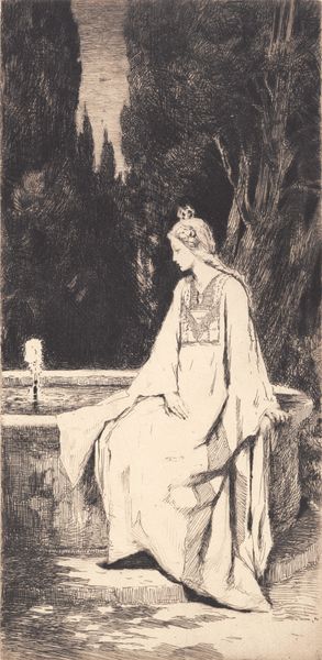 Frans Schwartz created this etching, Prinsessen ved springvandet, a title which translates to The Princess by the Fountain. As an etching, the artwork depends on the material interaction between metal and acid. The artist would have covered a metal plate with a waxy, acid-resistant substance, and then scratched an image into that coating, exposing the metal. Next, the plate was submerged in acid, which bit into the exposed lines, creating grooves. Ink was then applied to the plate, filling the grooves, and the surface was wiped clean. Finally, the image was transferred to paper under great pressure. Look closely, and you can see how this process results in a distinctive, slightly rough line quality. The hatching and cross-hatching, the buildup of these etched lines, creates the tonal variations and the overall mood of quiet contemplation. In Schwartz’s era, etching was often seen as a democratic medium, because it allowed for the relatively easy reproduction of images, and so brought art to a wider public. It is a reminder that the value of art lies not just in the image it presents, but in the means of its making, and its circulation.