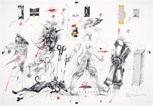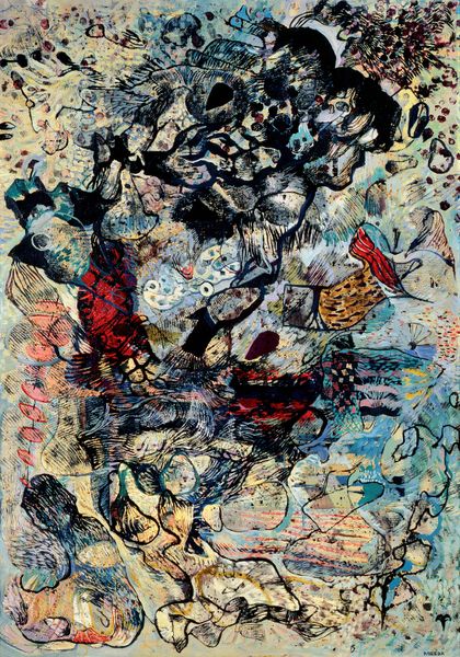 Curator: We're looking at Alfred Freddy Krupa’s "Easter Morning Sun 2020 (COVID-19 artwork no.3)", created with ink in 2020. It’s an arresting image. What’s your immediate reaction? Editor: Stark. The limited palette and frantic, almost violent brushstrokes evoke a feeling of intense anxiety. Is it meant to portray that particular Easter as bleak? Curator: Considering the title’s reference to COVID-19, that reading is certainly plausible. But look closer at the formal elements. The composition divides itself almost in half. Above, a skeletal dome; below, this field of...are they flowers? Editor: Yes, but deflated, bleeding red at their centers, drained of vitality. Note also how those flower stems reach upwards. Curator: The symbolic register here seems quite dense. Birds often represent freedom or the soul's flight. Here, they're predominantly black, perhaps a flock of ill omens gathering above this ravaged garden. It reminds me of plague imagery throughout history. Editor: Indeed. It is a modern memento mori of sorts, no? The dome above—is it representative of failed structures, perhaps even faith during times of crisis? I am seeing a crown, though it feels broken, powerless. Curator: One could argue Krupa constructs a visual metaphor where organic and architectural forms struggle to maintain structure amid chaos. The dominance of line over solid form enhances this feeling of fragility. The yellow and gold may speak to an ambition that falls flat. Editor: Despite the bleakness, I find something resilient here, an attempt to find light. Even in the decay, life, or its memory, persists in reaching towards the absent sun. Curator: Precisely. Through the work’s formal structure and the symbolic weight of these images, it serves not only as a lament, but also perhaps an assertion of life’s enduring impulse. Editor: A compelling intersection of personal response and cultural memory then, captured in swift strokes of ink.