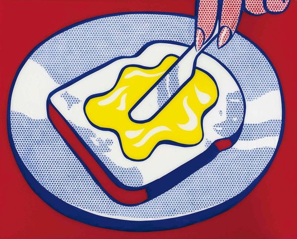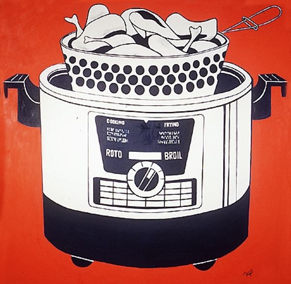 Editor: This is Roy Lichtenstein's "Washing Machine" from 1961, created using mixed media and acrylic paint. There's something unsettling about it, almost sarcastic, especially with the stark lines and bold colors turning this everyday appliance into a kind of cartoonish spectacle. What's your take on it? Curator: It's interesting you pick up on the sarcasm. Lichtenstein, like many Pop artists, was deeply engaged in the politics of representation. In the postwar era, consumer culture exploded, particularly in the United States. How do you think Lichtenstein’s choice to depict a washing machine, an object typically associated with domestic labor, speaks to the changing roles of women during that period? Editor: Well, the woman's hand looks almost like a disembodied, glamorous hand pouring detergent. It’s like this exaggerated, almost artificial depiction of domesticity. Maybe it's critiquing the idealized image of women in advertising? Curator: Precisely. And it's not just about critiquing advertising. Lichtenstein is forcing us to confront the underlying ideologies that shape our understanding of gender and labor. He is also commenting on art itself: he appropriated imagery and techniques from commercial printing, questioning the hierarchy between "high" and "low" art. Editor: So it's not just a picture of a washing machine, but a statement about society and the art world. Curator: Exactly. This seemingly simple image opens a Pandora's Box of questions about gender, class, and the very nature of art. Editor: I didn't think I'd be thinking so much about social issues just looking at a washing machine. That’s a very enlightening perspective! Curator: It's a testament to the power of art to make us see the familiar in a completely new light.