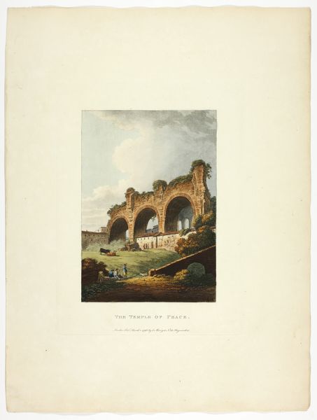 Curator: What a melancholic scene! M. Dubourg's "Title Page to Ruins of Rome," created around 1796, immediately sets a tone of wistful reflection. Editor: It’s certainly striking. My immediate reaction is to focus on the materiality: the ink bleeding into the paper, the watercolor washes that evoke a specific dampness, the layers of etching that comprise the ornamental borders... these things communicate decay and underscore the very theme itself. Curator: Precisely. The ruin motif is powerfully expressed through the overgrown archway framing the Roman landscape. Consider how arches, often symbols of triumph and power, are here reclaimed by nature. Ivy and flowers overtake what was once a proud structure. Editor: And consider the labor invested in creating that ornament. It's not just an archway; it’s painstakingly rendered foliate forms, carefully etched to resemble stone carving... juxtaposed against the literal breakdown of form that "ruin" suggests. Whose hand labored over this depiction, and what did *they* consume? Curator: The visual weight really contributes to that. Beyond simply showing crumbled stone, Dubourg reminds us that even the greatest civilizations are not immune to time. Note how he positions the viewer – perhaps the wanderer or collector of souvenirs -- as an outside observer looking back. Editor: Absolutely. One cannot look at "watercolor" or "etching" in isolation here; these techniques existed within a specific economic ecosystem tied to paper manufacture, pigment sourcing, print distribution... all these means of production determine our understanding of it now. Curator: The cityscape itself, including recognizable monuments like the Colosseum and what appears to be an obelisk, speaks to a romantic idealization of Rome, one filtered through a lens of nostalgia and loss. The piece uses a conventional vocabulary of form. Editor: Loss is the common experience, I suspect, to this title page... considering that all of that elaborate fabrication through aquatint and line engraving yields not a literal guide, but a poetic rumination on impermanence in relation to material creation and consumption. Curator: The way those forms fade and blend makes you realize nothing gold can stay. The artwork leaves you contemplating the cultural memory embedded in Rome’s decaying grandeur, how history persists and erodes, sometimes simultaneously. Editor: It serves as an aesthetic object while quietly signaling labor, social relationships and consumption. That for me is where its true interest lies.