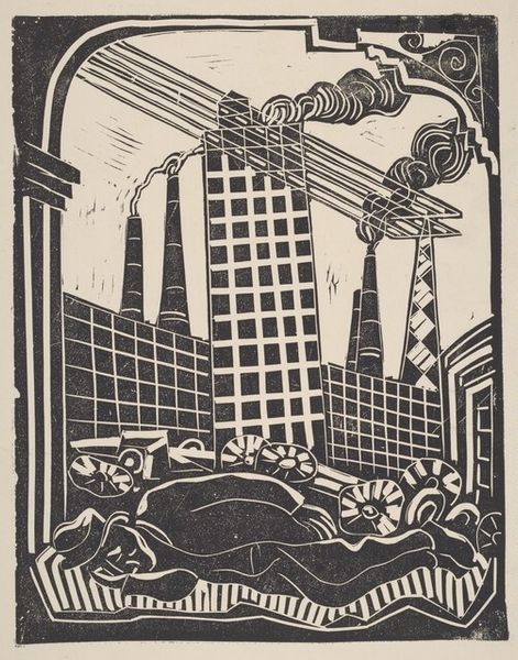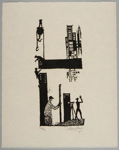 Editor: This compelling black and white print, "Coal Mining" by Harry Sternberg, presents a stark image of industrial machinery. The rough texture makes me think of the physicality of the work it depicts. What do you see in this piece? Curator: I see a powerful commentary on labor and industry. Sternberg's choice of printmaking, a medium capable of mass production, is crucial. Consider the materiality of coal itself, fueling industrial progress, yet extracted through strenuous labor. How does Sternberg portray that tension between progress and human cost? Editor: It's a somber image. I hadn't considered the choice of printmaking as a reflection on mass production, but it makes sense. Thanks! Curator: Understanding the means of production deepens our understanding of the artwork’s social commentary.