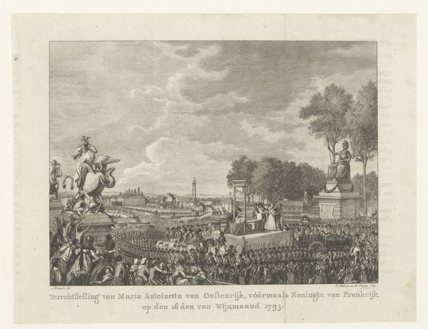 Iven Besoet rendered this engraving, 'IJsvermaak op een ondergelopen stuk land te Den Haag', or 'Ice Amusement on a Flooded Piece of Land in The Hague,' in 1757. The eye is drawn into a panoramic scene where a multitude of figures populate a frozen landscape, all meticulously rendered in a monochromatic palette. The composition is structured by a stark contrast between the densely populated foreground and the expansive, almost ethereal background. The network of finely etched lines creates a complex interplay of light and shadow, giving depth to the frozen expanse. The texture of the ice, the intricate details of the figures, and the bare trees contribute to a rich visual experience. The scale—the diminishment of figures towards the horizon—is a conventional technique to convey spatial depth, yet it also serves to highlight the collective experience of the community. The windmill stands as a stoic vertical marker, contrasting with the horizontal sweep of the icy plain, and represents a nexus of nature, culture, and society.