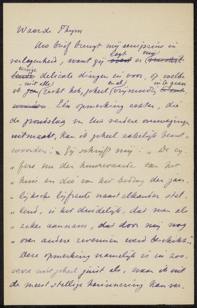 This is a letter, Brief aan Etha Fles, made in 1900 by Jan Veth. The visual field is dominated by lines of cursive script in dark blue ink, contrasted against the off-white paper. The letter is presented in portrait orientation and the textured paper offers a tactile, almost sculptural quality. Veth’s selection of handwriting as a medium is not merely a practical choice, but a conscious artistic decision. The flowing, almost rhythmic quality of the handwriting creates an intimate connection between the sender and the recipient. The handwritten form introduces elements of personal expression, transforming the letter into a unique artefact that transcends its purely communicative function. Note the structure of the text, from the salutation “Beste Etha” to the closing remarks. The interplay of form and content destabilizes established meanings, inviting us to reconsider the relationship between personal communication and artistic expression. The letter is not simply a means of conveying information but also a space where ideas are negotiated and re-interpreted.
