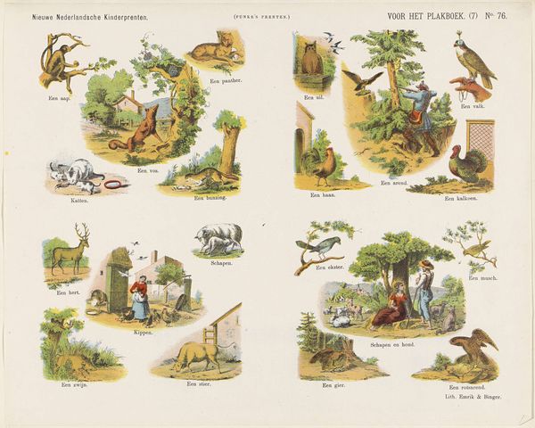 Editor: We're looking at "Allerlei," a coloured-pencil drawing from 1873 by De Ruyter & Meijer. It has a playful, almost scrapbook-like quality with all the miniature scenes and objects laid out on the page. What structural elements do you observe that tie this piece together? Curator: Notice how the composition is rigidly organized, contrasting with the "Allerlei"—or "miscellany"—theme? The array of vignettes are constrained within a rectilinear format. The lines formed between them function as a grid, dictating visual access. Note how certain blocks draw the eye using higher contrast or dynamic movement within the static grid structure. How does that tension inform our understanding? Editor: The tension makes me wonder about the function. Was this simply an aesthetic exercise, or did the piece have a utilitarian purpose? Curator: An excellent question! The internal structures provide some insight. Do you observe any hierarchy or visual narrative amongst the illustrations? Editor: Perhaps the placement of the larger forest scenes suggests a grounding or foundational element, with the smaller vignettes acting as satellite details… like sketches in a larger composition. Curator: Precisely. So, rather than pure representation, consider the abstract interplay. Focus on the spatial relationships, the contrast between detailed renderings and more rudimentary forms. Does this visual "miscellany," carefully structured, start to communicate a more coherent idea about representation? Editor: I hadn’t thought about it that way. I was too caught up in deciphering the images themselves. I see how considering the format adds to the viewing experience. Thank you! Curator: And thank you for offering insightful observations; I'll keep that perspective in mind when I encounter artworks with apparent incongruities between their composition and content.
