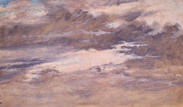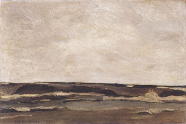 Curator: It’s funny, my first thought is “melancholy masterpiece,” though maybe I'm projecting after a long day. There's a quiet drama here. Editor: This evocative painting is "Evening Sun" by Rudolf Jurriaan Stephanus Haak, created sometime between 1882 and 1892. The loose brushstrokes create a landscape that feels both familiar and dreamlike, like memory fading at the edges. I’d guess oil on canvas, given the texture. What stands out to me immediately is the tension. Curator: Tension? Between what, do you think? The brushstrokes almost seem at odds with each other. Editor: Well, you've got this really luminous sky almost battling with the darkness below the horizon, a powerful kind of division playing out that hints at more than just weather. Considering its creation within a context of burgeoning imperialism and anxieties around modernity, one could interpret this tension as representative of broader socio-political struggles of that period. That lower third… it looks almost like a barricade. Curator: That's a really interesting reading. I’ll be honest, I was thinking more personally. The way the light struggles through the clouds, that sliver of a moon… It feels like a glimpse of hope battling despair. Isn't it amazing how a simple landscape can be such a complex emotional trigger? I imagine Haak himself feeling conflicted. Perhaps even experiencing both. Editor: And doesn’t the use of color do something similar here, reflecting the artist's perspective? This muted palette almost seems to drain away color, giving way to darker and richer shades along the tree line. It's fascinating to consider the symbolism that nature holds in art. It’s as if Haak externalizes this dichotomy in nature. Curator: Definitely! And I think those rough, almost hurried brushstrokes amplify it. It doesn’t feel neat and tidy; it’s raw emotion captured in paint. Almost a therapy, externalizing a landscape and oneself on a surface to better confront it, piece by piece. It invites empathy, doesn’t it? Editor: Absolutely. Looking closely, there’s an incredible fluidity in the brushwork, and the heavy impasto adds this really tactile dimension. The canvas, like nature, like our struggles, is not smooth but deeply textured, both scarred and lovely. Curator: "Scarred and lovely"—I love that! It’s exactly what it is, actually. Makes me look at it in a whole new light. Thanks. Editor: And thank you for allowing a deeper reading, contextualizing it into the artist himself as the work progresses. That truly reveals the complexity of even a fleeting moment of the "Evening Sun."