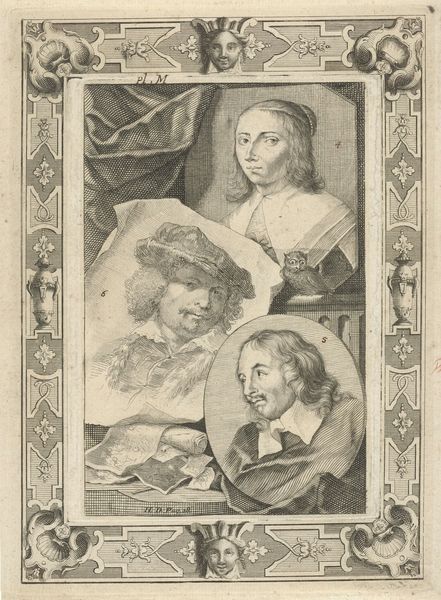 Curator: Hmm, there's a collection of faces vying for my attention, all crammed together. Something about that big hat, though—it practically steals the show! Editor: Yes, it’s Jacob Ernst Marcus’ "Portraits of Cornelis Visscher, Jan de Visscher, Richard Brakenburg and Quiringh Gerritsz. van Brekelenkam," created around 1815. The engraving, part of the Rijksmuseum’s collection, captures the likeness of these individuals, but it almost feels as though it goes beyond just representation. Curator: Representation... that’s one word for it. Those faces are like looking into slightly distorted mirrors. There’s a touch of humor in the execution. Caricature almost. Is that a reflection on the sitters, or more a reflection of the social perspective of the artist, I wonder. Editor: It’s interesting you say that, considering that Jacob Ernst Marcus was active during a time when artistic patronage and public reception were changing rapidly. While ostensibly academic in style, these prints catered to a growing middle class interested in genre scenes and, yes, even gentle caricatures of public figures or artistic personalities. It was all part of forging a shared visual culture. Curator: A shared visual culture that possibly chuckled at the expense of its creative elite? Makes you think. Those slight exaggerations could tell stories that formal portraiture wouldn’t dare touch. Perhaps it’s even challenging this stuffy notion of 'high art'. What's compelling here is that these artists, known for Baroque brilliance, get the print treatment – suddenly accessible, but maybe subtly critiqued. Editor: Absolutely. Reproducing portraits through engravings democratized art, bringing it to a wider audience. However, the act of choosing *which* artists to portray and *how* becomes a commentary in itself. Consider the setting; this work appearing in the early 19th century hints at how earlier artistic masters were being reimagined or perhaps even co-opted within new social frameworks. It’s like saying, "We admire these figures, but we also have a different, more familiar way of seeing them." Curator: So, beyond just immortalizing their faces, this piece throws these artists into the social arena for discussion. Nice hat or no nice hat, each character quietly whispers of status, ambition, and how perception, ultimately, plays the largest part. Editor: Precisely, it becomes more than a set of likenesses—it’s a document reflecting changing tastes and social structures. It reveals as much about its time as it does about the individuals portrayed. Curator: Right, art looking back at art…layers within layers. I will never look at an old hat quite the same way again!