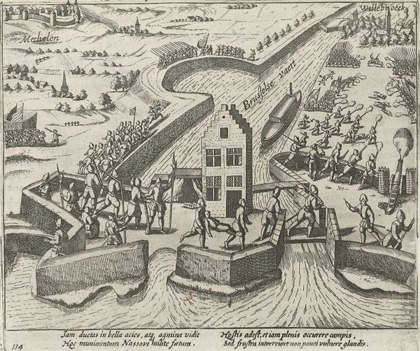 Curator: Here we have an engraving, made between 1613 and 1615, depicting the Siege of Maastricht in 1579. It's unsigned. Editor: My goodness, what a chaotic scene! The overwhelming sense is of disorder and struggle. Bodies are flung about, weapons raised—it's really quite visceral for a print. Curator: Indeed. Let's consider the composition. The anonymous artist uses a high vantage point to depict the city and the besieging forces simultaneously. Note how the rigid lines of the city walls contrast sharply with the dynamic curves of the figures in the foreground. Editor: That bridge becomes the focal point, doesn't it? It's almost like a stage upon which human drama plays out. Bodies falling into the water...it speaks to me of the desperation of those defending the city, a moment of profound loss. Curator: Absolutely. The engraving excels in visual rhetoric, carefully constructed contrasts to convey tension. Observe, too, how the perspective flattens toward the city, emphasizing its mass, its apparent impenetrability before the breach. The stark lines, the black and white contrast…it all creates a sense of harsh reality. Editor: It's interesting how they’ve used that almost bird's-eye perspective to flatten the narrative; to encompass the city's plight. And yet, within that generalized view, those figures in the foreground, their faces etched with pain, remind us that even epic conflicts are comprised of individual sufferings. I keep returning to the woman being flung from the bridge - an echo perhaps, of similar female figures in classical scenes of chaos. Curator: I agree; the use of these figures can allow us to consider some wider symbolic readings of suffering, and conflict in the work. There is careful application of light and shadow to articulate form and deepen the dramatic intensity which serves the core message of the scene. Editor: This small print holds such a powerful charge. Seeing such anguish and the sheer violence represented really hits home, and makes us ponder on how it affects each and every member of a population during the seize of a city. Curator: I agree. It reminds us of the powerful capability of simple formal choices and how even the sparsest rendering of graphic imagery holds narrative power.