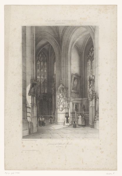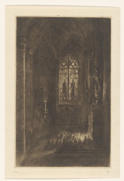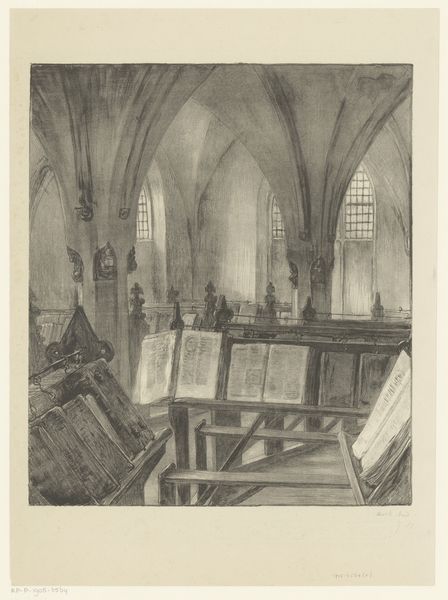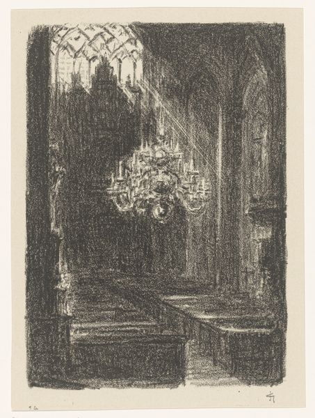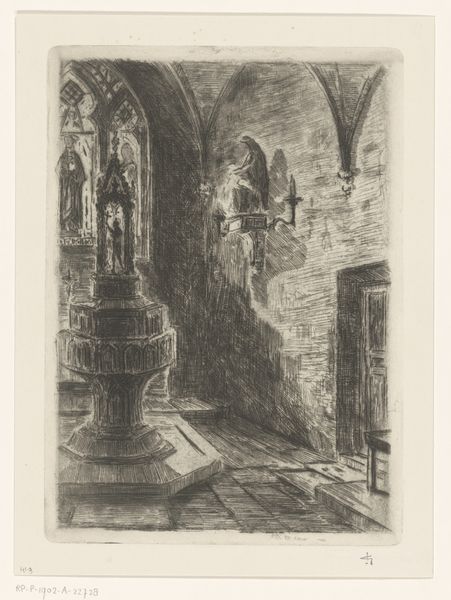 Editor: This is "Chapel in a Church in Cleves" by Carel Nicolaas Storm van 's-Gravesande, dating from 1851 to 1902. It’s a pencil drawing currently held at the Rijksmuseum. The somber, almost brooding atmosphere really grabs me. What can you tell me about it? Curator: This drawing speaks volumes about the evolving relationship between art and institutions in the late 19th century. We see van 's-Gravesande engaging with the Romantic tradition's interest in architectural ruins and sacred spaces. But beyond personal aesthetic expression, consider how such images, readily reproducible, shaped the public's perception of religious architecture. Why do you think an artist would choose to depict a chapel interior in this era? Editor: Perhaps there was a growing interest in preserving historical sites, or even a nostalgic yearning for a disappearing religious world. Curator: Exactly! Museums were becoming increasingly popular, exhibiting and archiving such pieces, and in doing so they were creating a visual record, standardizing the interpretation of these spaces for a broader audience. Do you notice any social commentary, overt or otherwise? Editor: It's difficult to say definitively, but the lack of people in the image, the sketch-like quality, could suggest a sense of absence or perhaps even a critique of the church’s diminishing influence. Curator: An astute observation! And think about the role the Rijksmuseum plays now. By displaying this work, what narrative is the museum furthering about Dutch cultural heritage? About religious identity? How does the romantic interpretation influence those understandings? Editor: That’s fascinating. I hadn't considered the museum's curatorial voice in presenting a seemingly simple drawing. Curator: It reveals how profoundly historical context shapes our experience, doesn't it? Seeing a piece in a museum gives the drawing a new historical framework to be observed through.