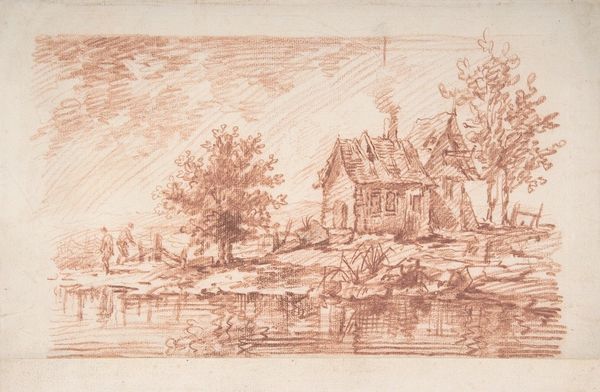 Editor: This is Jan Gerard Smits’ "Hengelaar op een bruggetje bij een boerderij", an etching from 1875, depicting a lone fisherman on a bridge. There’s a stillness to the image, a quiet simplicity. What catches your eye most in this piece? Curator: The fishing rod almost bisects the frame, doesn't it? But, it's more than a visual element. Fishing is a potent symbol in art history - the fisher of men, divine abundance, a solitary pursuit. Look at how the figure blends into the rural environment. Do you think it is suggesting a harmony or perhaps even tension between man and nature, reflecting a societal shift of values toward a nature and away from agrarian life? Editor: That’s interesting, I hadn’t thought of that symbolism. I mostly saw it as a realistic depiction of Dutch rural life at the time. Is there a deeper cultural connection in Dutch art with that particular symbol? Curator: Yes, absolutely. The Dutch Golden Age had a fascination with domestic scenes interwoven with symbolism and moralizing, and this print seems to be recalling this era. Also, notice the artist’s hand here—etching allows for such incredible detail. What sort of cultural weight is conferred to nature in a rapidly industrializing country that the artist may be trying to highlight? Editor: I see your point. It seems to hint at an older way of life on the brink of change. Thanks, I'll never look at a simple fishing scene the same way again. Curator: And I'm drawn to how you related this to contemporary movements. It's important to view art as a lens for culture change, whether intentional or incidental.