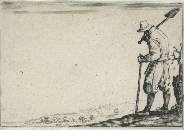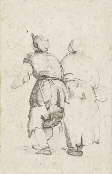 Harmen ter Borch created this drawing, "Rij lopende soldaten," using pen in gray, around 1650. The eye is immediately drawn to the trio of soldiers, rendered with swift, almost ephemeral lines. Notice how the artist uses hatching and shading to give form to the figures, creating a sense of depth and movement across the composition. Ter Borch's focus isn't on precise detail but rather on capturing the essence of these figures as they progress forward. The sketch-like quality invites us to consider the nature of representation itself. The artist uses a minimal amount of lines to convey the weight each soldier carries. Through this approach, the drawing transcends a simple depiction of soldiers, acting as a study in form, movement, and the very act of seeing. This piece becomes a meditation on how lines alone can evoke the human condition.