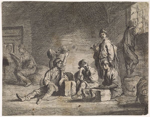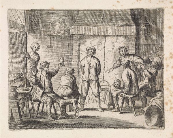 Matthijs Schoevaerdts's "Spel met de appel," the etching's intricate composition and chaotic energy draw you into a boisterous scene. The composition is structured around a central cluster of figures, their animated gestures and expressions rendered with fine, decisive lines. Schoevaerdts masterfully uses the etching technique to create tonal variations, contrasting darker areas with lighter ones to emphasize the depth and texture of the scene. The dense arrangement of bodies and objects creates a dynamic tension, while the subtle gradations of light and shadow evoke a sense of movement. The setting is likely a tavern, and the revelry, with its blend of celebration and disorder, reflects the complex social dynamics of its time. The artist subtly critiques societal norms, inviting viewers to consider the underlying tensions between order and chaos. Consider how the interplay of line, tone, and composition challenges our perceptions, provoking thought and inviting ongoing dialogue.