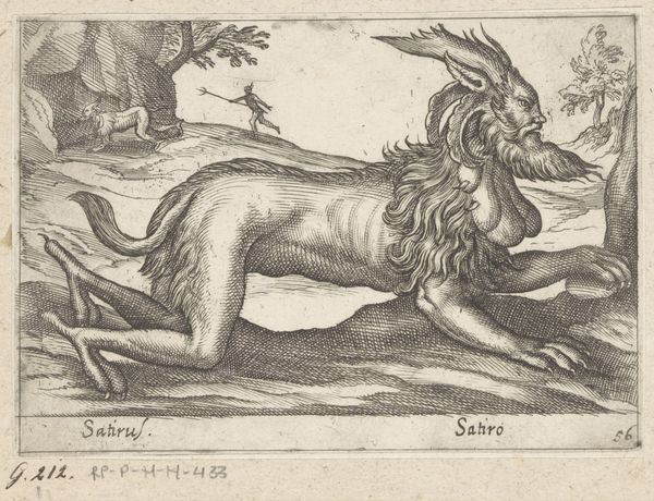 Antonio Tempesta made this print of a Manticore in the late 16th or early 17th century. It's an etching, meaning that the artist would have used a sharp needle to draw through a wax ground on a copper plate, which was then submerged in acid. The acid bites into the exposed metal, creating lines that hold ink. Look closely and you'll see how Tempesta used layers of hatching to build up the forms of the fearsome creature, and to describe the landscape it inhabits. The print medium was closely linked to commerce; prints were relatively cheap to produce and easy to disseminate widely. The imagery is of its time, but it also speaks to the timeless power of the graphic arts, and how such images can capture the imagination. The Manticore is a mythical beast with the body of a lion, a human head, and a tail that can shoot venomous spines – a striking example of the enduring human desire to mix the animal and human realms, and to picture the hybrid monsters that result.