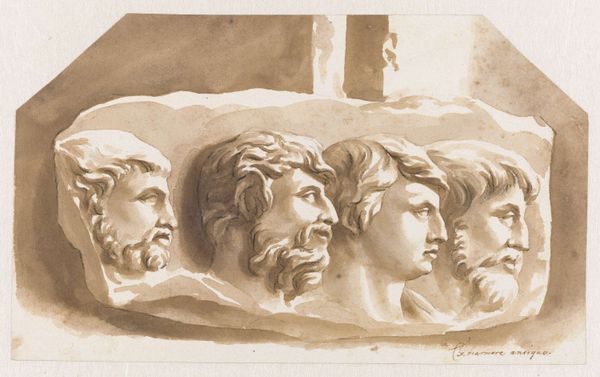 Curator: This is a work by Louis Ducros, dating back to 1778. It's entitled "Two heads of statues from the theater of Taranto, unearthed in the presence of the artist" and done with watercolor on paper. Editor: There's something haunting about these two heads floating on the blank paper. The man on the left, with his beard and laurel wreath, appears regal yet forlorn, doesn't he? Curator: Indeed. Ducros captured these ancient busts during a period of heightened archaeological interest in Italy. It speaks to a broader cultural fascination with classical antiquity and its artistic traditions. It comes out of the Neoclassical movement in the late 18th century, fueled by archaeological finds. It was quite common to depict classical artifacts. Editor: Absolutely. The image evokes the allure and mystery of lost civilizations, and the heads appear almost ghostly, as if just emerging from the earth itself. Do the specific individuals represented in the statues carry any known symbolic weight, or tell us anything about the context? Curator: While we can't pinpoint exactly who these portraits depict, the head with the wreath suggests a king or even a god, perhaps Apollo or Zeus, given the Tarentine location. Their survival, even in fragments, reinforced the idea of the enduring legacy of the classical world and would've sparked great debate at the time. The location too—Magna Graecia and ancient power—really drives the art and the statement about classicism home. Editor: I see that continuity. And their isolated presentation emphasizes the preciousness of each archaeological find, doesn’t it? The contrast is so striking with that wide empty space, it's as if they were floating in an archive of collective memory. Curator: Precisely. Ducros wasn't simply creating a record; he was participating in the cultural work of recovering and interpreting the past, lending dignity through his artwork. It all demonstrates the intense engagement of artists and intellectuals with the physical remnants of classical culture. Editor: It's amazing how a simple watercolor sketch can transport us to another time, provoking us to consider both what's lost and what continues to resonate. Curator: Exactly, art becomes a way for history and symbolism to converge, enabling viewers to grapple with those tangible fragments of the distant past, which, in turn, still echo through time.