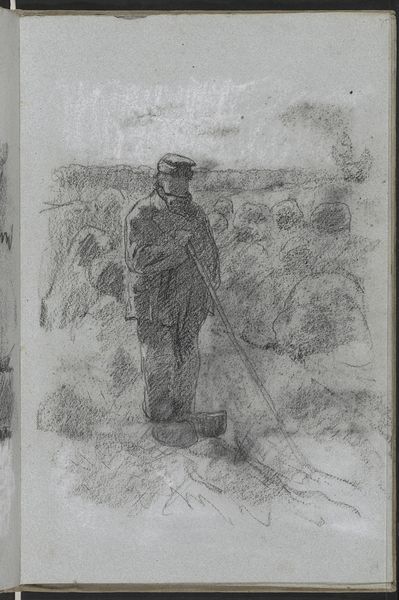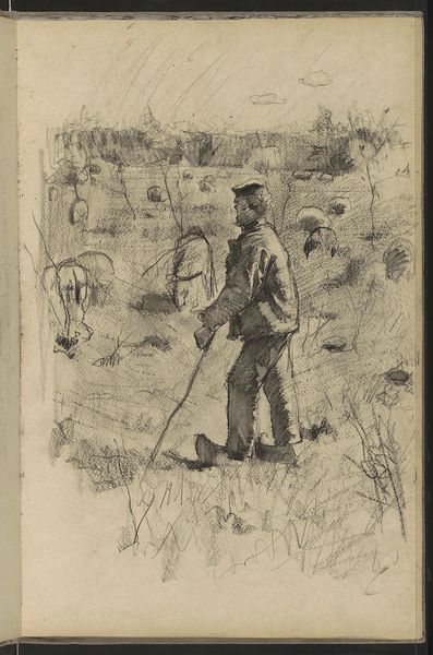 Willem Witsen created this landscape with a shepherd in pencil on paper. It’s a quick sketch, capturing a shepherd leaning on his staff, surrounded by sheep in a vaguely defined landscape. The choice of pencil as a medium is interesting. It allows for a level of detail and shading, yet it's also immediate and easily erasable. The marks are evident, the labor unhidden. Pencil drawings, traditionally seen as preparatory studies, were becoming increasingly valued as finished works of art in this period. The material itself has an interesting class valence, pencils being associated with the accessibility of drawing as a skill. Witsen’s use of the pencil captures both the landscape and the labor of the shepherd. It invites us to consider the value of both skilled artistic labor and manual rural labor, and it challenges conventional distinctions between fine art and craft.