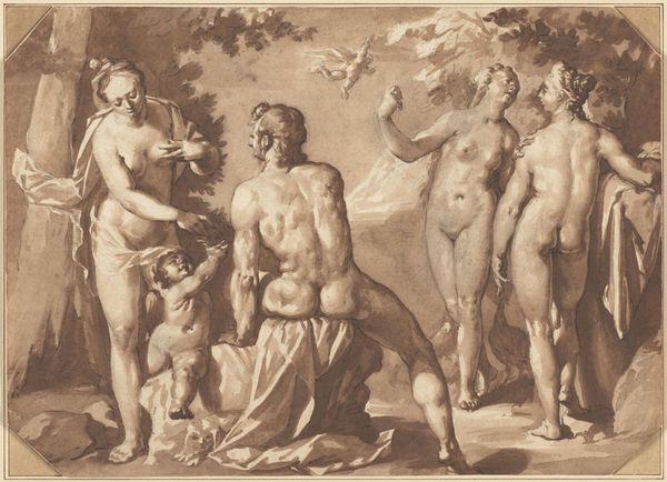 Editor: Here we have Jan Muller’s engraving, "The Three Fates: Clotho, Lachesis and Atropos," from sometime between 1587 and 1591. There’s something unsettling about it. The figures seem to be presented without any romanticization, quite frankly rather confrontational. What do you see in this piece, from a historical perspective? Curator: It’s precisely that unsettling feeling that makes this engraving so compelling! Muller is working in the Mannerist style, which deliberately departs from Renaissance ideals of beauty and harmony. It disrupts conventional notions of femininity. Instead of idealizing, Muller presents powerful women who control destiny, life, and death. These Fates were a reflection of the social norms of their time – women confined to reproduction – yet the Fates hold considerable authority. How does that read for you? Editor: That's a sharp contrast. It makes me think about the period's anxieties around women's roles – were they venerated or controlled? The exaggerated musculature of the figures and their positioning adds a layer of complexity to that tension, right? Curator: Exactly! And consider the historical context. The late 16th century was a time of immense social and religious upheaval, including the Protestant Reformation. These visual depictions, combined with text below it that reinforces the importance of choice of life and death. Do you see echoes of that turmoil? The deliberate contravention of norms? The piece can be interpreted as a reflection on power structures and mortality within these shifting social contexts. Editor: That is a powerful reading of it. I can now understand why it seemed so unsettling initially. It speaks volumes about how women were both deified and repressed, wielding ultimate power yet subjugated in their era. Curator: And that interplay is why engaging with the historical and social contexts of art enriches our understanding of both the work and ourselves.