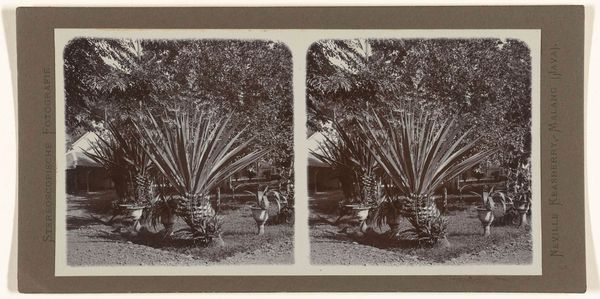 Editor: This photograph, "Zeldzame grasboom die alleen in Australië groeit"—or "Rare Grass Tree that Only Grows in Australia"—is attributed to Neville Keasberry and was taken sometime between 1900 and 1935, using a gelatin-silver print. It looks… staged, somehow, but maybe that’s just the double frame. What do you see in it? Curator: Staged, yes, but maybe a deliberate choice, playing with that slightly uncanny feeling that early photography often evokes! What grabs me is this incredible grass tree itself, almost like a fantastical creature posed in front of the somewhat colonial-looking house. Look at the texture captured in the print—those spiky fronds, so different from the manicured gardens surrounding it. It’s like nature is trying to reclaim the scene. Do you get a sense of that tension too? Editor: I do now! It's less of a portrait of a plant and more like a portrait *with* a plant, in a specific time and place. Curator: Exactly! And consider this was a stereoscopic photograph, meant to create a 3D effect. Imagine how that would amplify the strangeness of the tree, making it pop out from its surroundings. It transforms the image from a simple botanical study into something much more… theatrical. Editor: So, the framing and the 3D effect really play up the weirdness? I’d have missed that. Curator: Completely. The colonial gaze observing nature but slightly perplexed. These early photos can be full of surprises. Editor: That’s such a different way of looking at what I thought was just a picture of a tree. Thanks for opening my eyes.