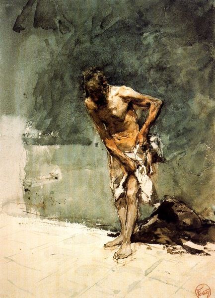 Curator: Welcome. Today we'll be discussing "Christ Head" by Nikolai Ge. It is on display here at the Museum of Russian Art in Kyiv. Editor: It’s certainly a visceral painting. The first impression is one of profound suffering, intensified by the murky, almost feverish palette. Curator: Ge's use of oil paint is striking. Look at the impasto—the thick application of paint. It's particularly noticeable around Christ’s face and the crown of thorns. This technique gives the painting a textural, almost sculptural quality. Editor: It's Expressionistic, bordering on the grotesque. What compels me most is the clear intention to depict the raw, brutal reality of crucifixion, countering the sanitized and idealized versions often presented in Western art. We should contextualize this in light of Ge's own spiritual crisis, and the broader socio-political upheavals occurring in Russia. The image then stands as a powerful indictment of both religious hypocrisy and societal violence. Curator: The dynamism and intensity in the brushwork cannot be overstated. It communicates far beyond representational likeness. Note how the color choices create form: light against dark shapes the face, or suggests the twisted wooden cross and wounded brow. Editor: Precisely, it invites crucial discussion of Christ's identity, his position as both divine and profoundly human, and the narrative power the Church can wield for power. Ge invites the viewer to actively engage with the immense suffering depicted. It resonates profoundly within the history of political art that demands social action and refuses complacency. Curator: And formally, it's remarkable how such a limited color palette, these greens and browns and blood reds, achieves such emotional complexity. The restricted tonal range is, in itself, an active element of its powerful and ultimately affective design. Editor: An image fraught with suffering, challenge, and deeply felt belief in social justice through empathetic reflection, leaving one ultimately unsettled. Curator: It does that. A truly powerful example of the Expressionist style in its handling of texture and hue, capturing both spiritual struggle and a palpable, human element.
